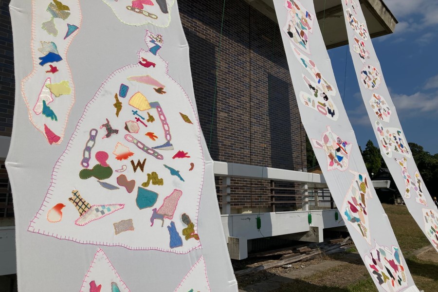 展示されるのは、2023年度丹後地域プログラムにて制作された作品。丹後の資源である「布」と「糸」を用いて「町を縫う」取り組みを通し、地域の個性を一つに紡ぎ上げた成果です。